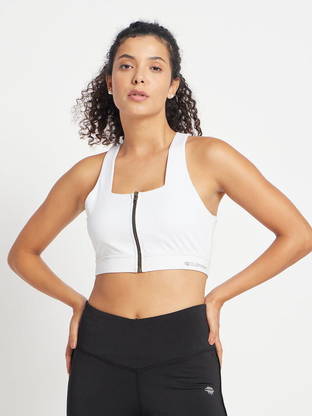 Nylon Front Zip Closer Sports Bra – White